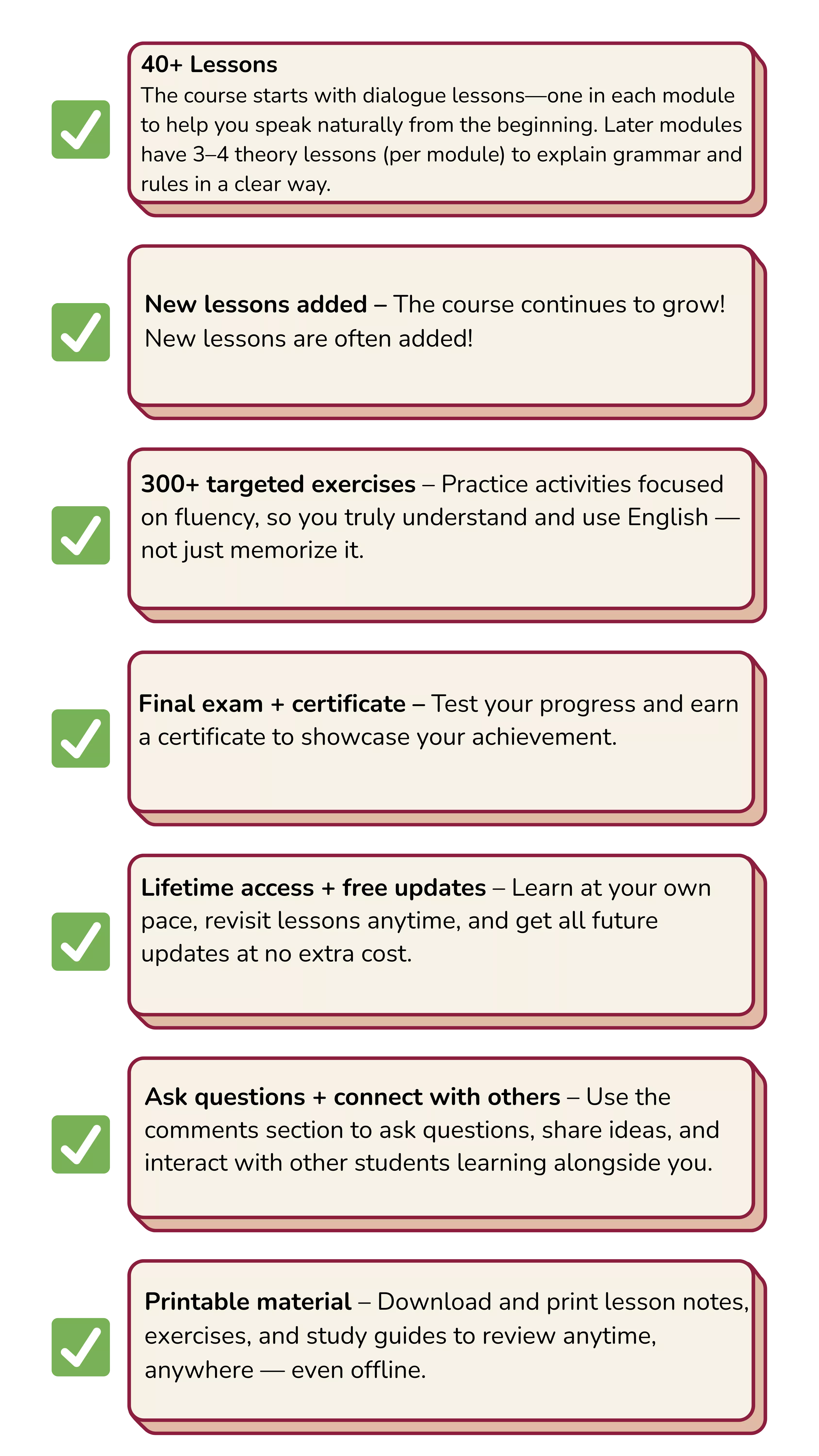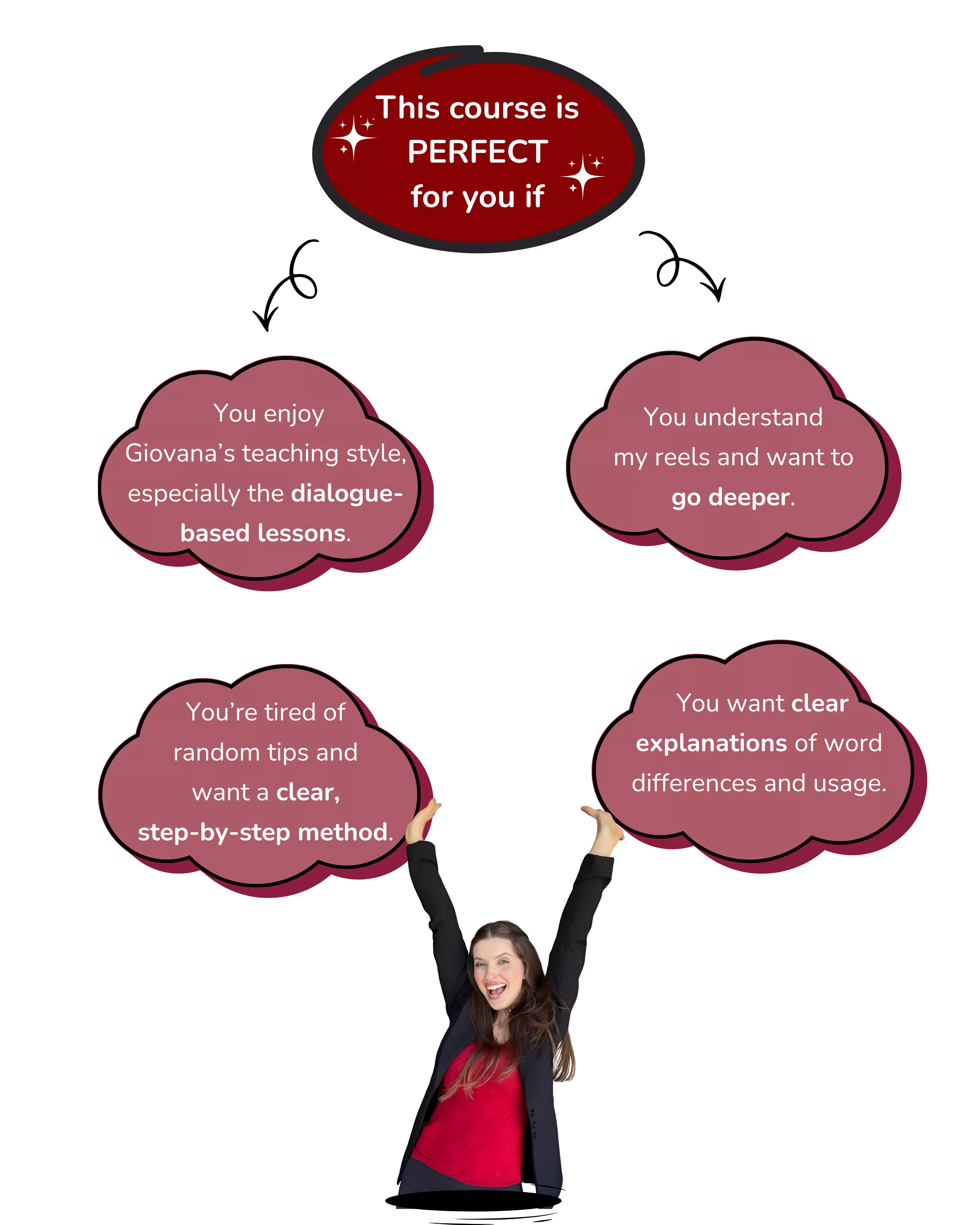 The course includes fun and highly valuable dialogue lessons posted every week, plus 9 extra modules with 3–4 lessons each. You can go at your own pace — no pressure or deadlines! You’ll also have lifetime access, so you can review and complete the course whenever it works best for you.
